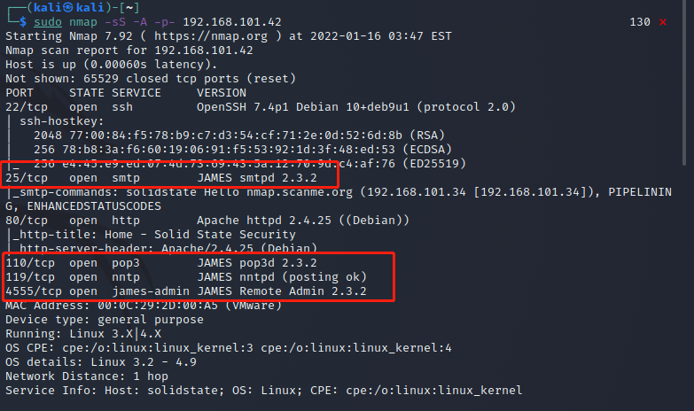 除了常规的ssh和http服务,还扫出一堆JAMES,有诡异……看这smtp和pop3都被扫出来了,这关恐怕和邮件大有关系