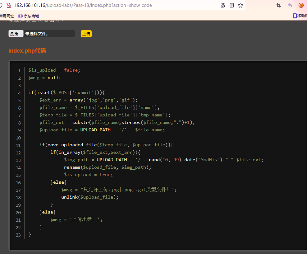 首先用move_uploaded_file()函数把上传的图片以文件原本的名字保存在upload文件夹下(这就是通关的时候访问的临时文件);