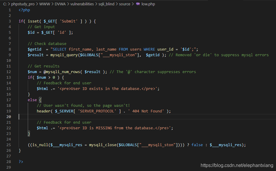 简单看一下本关代码,由于用户传入的id参数可以被当作sql语句执行,导致了sql注入漏洞。不过比起SQL Injection关卡low关稍微好点的是,对用户屏蔽了数据库错误信息,另外,就像刚刚说的那样,19行对sqlmap传马也起到了一些干扰。