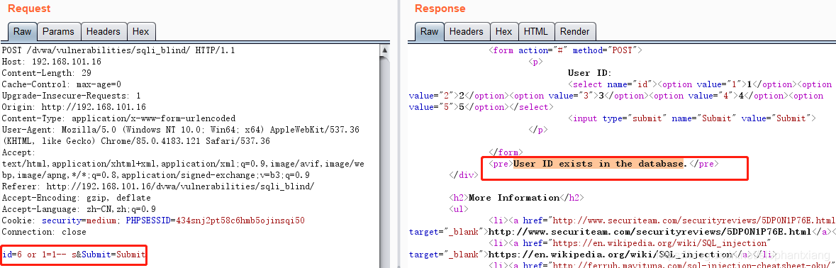 id=6 or 1=1-- s时返回User ID exists in the database,可以判断id可注入,并且不需要闭合。