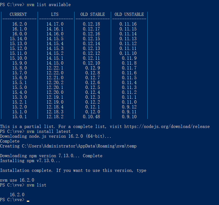 $ nvm list available //查看可以安装的node版本