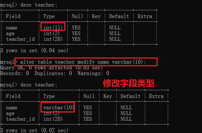 alter table 表名 modify 字段名 新类型 [新属性] [新位置];