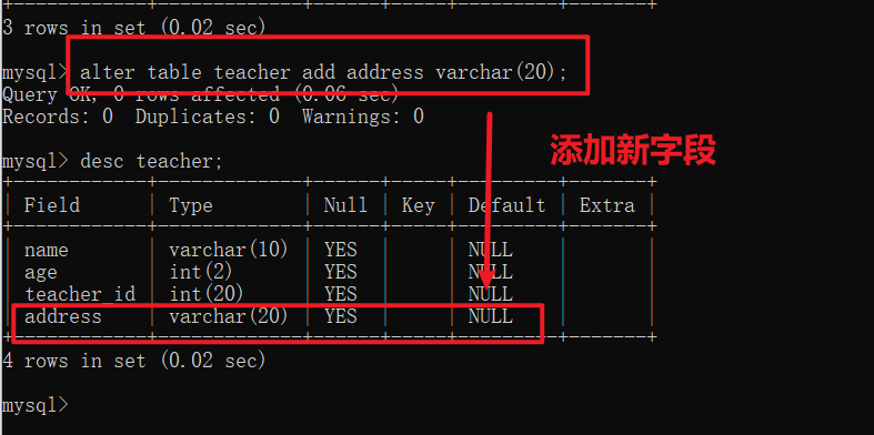 alter table 表名 add [column] 新字段名 列类型 [列属性] [位置 first/after 字段名];