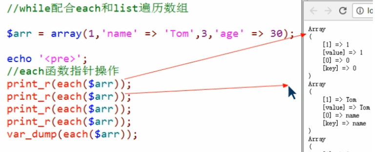 each()函数的使用: each能够从一个数组中获取当前数组指针所指向的元素的下标和值,拿到之后将数组指针下移,同时将拿到的元素下标和值以一个四个元素的数组返回: