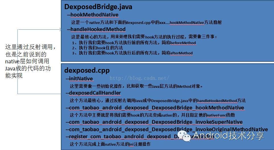 所以我们在整个过程中可以看到,先通过JNI注册,从Java世界转到Native世界,然后在native世界中主要修改被hook方法的一些信息,然后在通过反射调用handleHookedMethod回到Java世界。Android中免Root实现Hook的Dexposed框架实现原理解析以及如何实现应用的热修复_尼古拉斯.赵四的博客-CSDN博客_dexposed