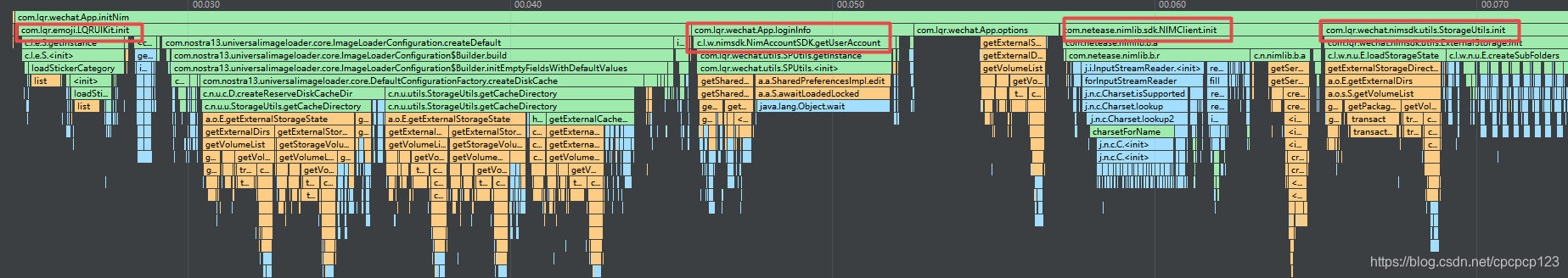 如图所示,我们可以清楚的看到在onCreate中每个初始化函数的耗时时间,我么只需要依次分析下耗时较多的函数里面是否是必须要在onCreate中完成的,如果是非必须的,我们可以开启线程或者放到后面一些执行,以免影响应用启动耗时: