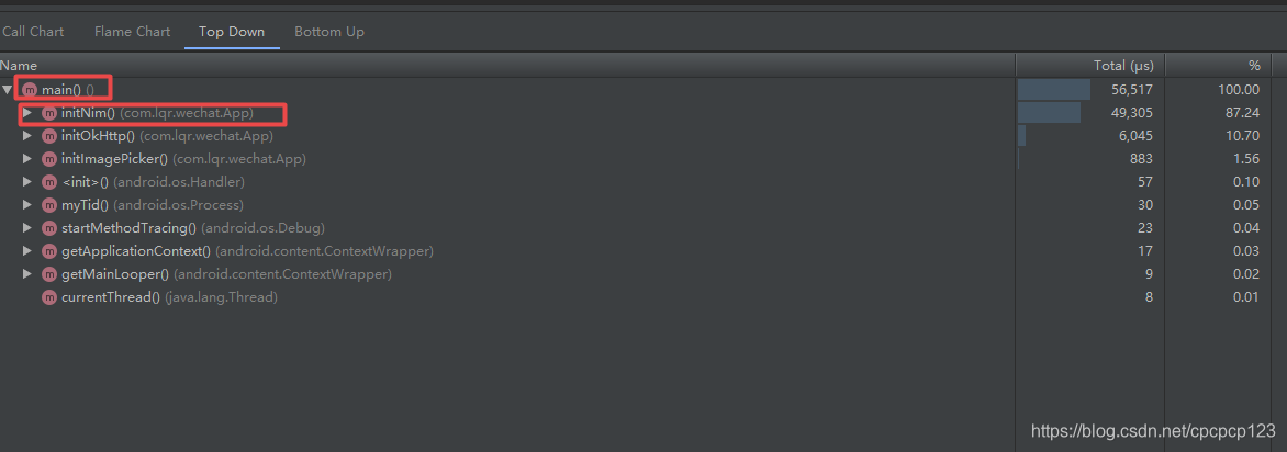 可以非常清楚看到onCreate初始化总耗时56ms,其中的intiNIM函数就占了49ms,占比87%,因此我们后面集中精力优化下这个初始化函数,把不必要的操作移动到后面进行,以免它的初始化占用了过多的启动时间。