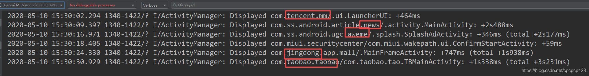 快捷查看APP启动时间: 方式一:在log中使用Displayed关键字即可如下:依次打开了微信、头条、抖音、京东、淘宝,京东冷启动750ms,淘宝冷启动竟然到了3.2S