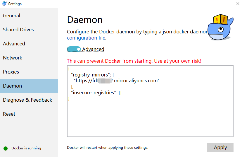 rrors 一栏中填写加速器地址 https://registry.docker-cn.com ,之后点击 Apply 保存后 Docker 就会重启并应用配置的镜像地址了。