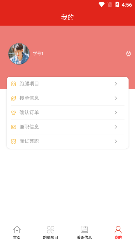 管理员:首页、个人中心、学生管理、雇主管理、企业管理、项目分类管理、跑腿项目管理、 接单信息管理、确认订单管理、兼职信息管理、面试兼职管理、系统管理等
