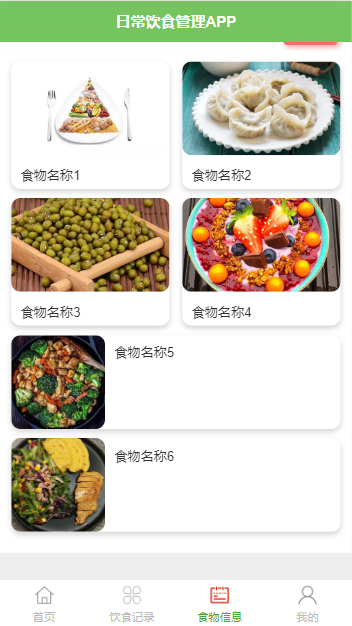 普通用户:首页、饮食资讯、饮食记录、食物信息、我的等