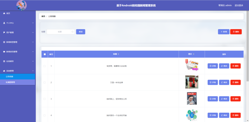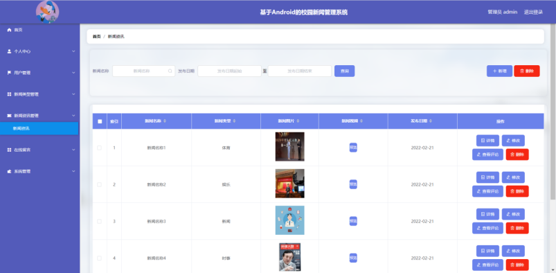 管理员:首页、个人中心、用户管理、新闻类型管理、新闻资讯管理、在线留言、系统管理等