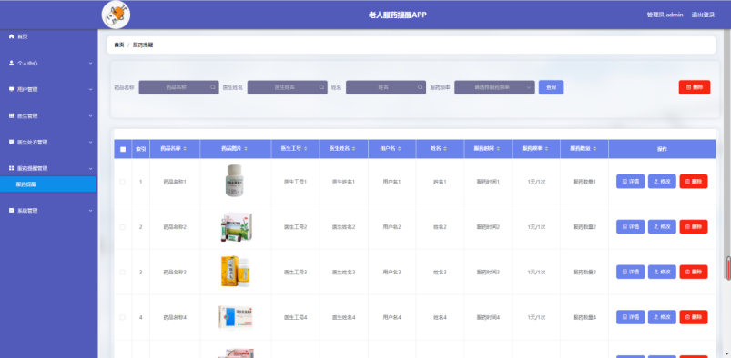 管理员:首页、个人中心、用户管理、医生管理、医生处方管理、服药提醒管理、系统管理等