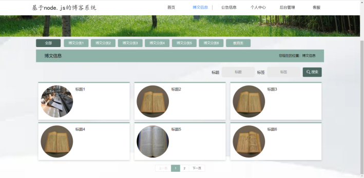 管理员:首页、个人中心、用户管理、博文分类管理、博文信息管理、系统管理等