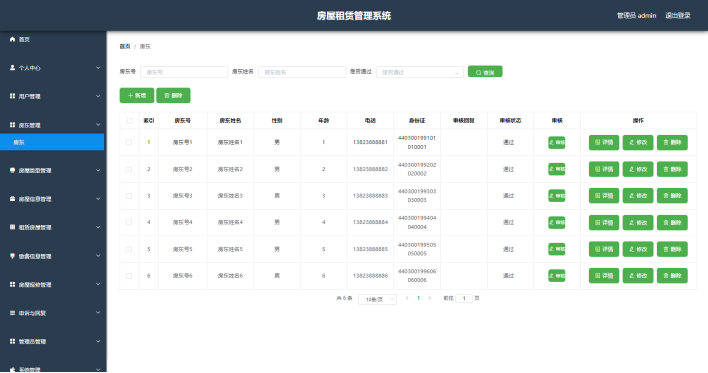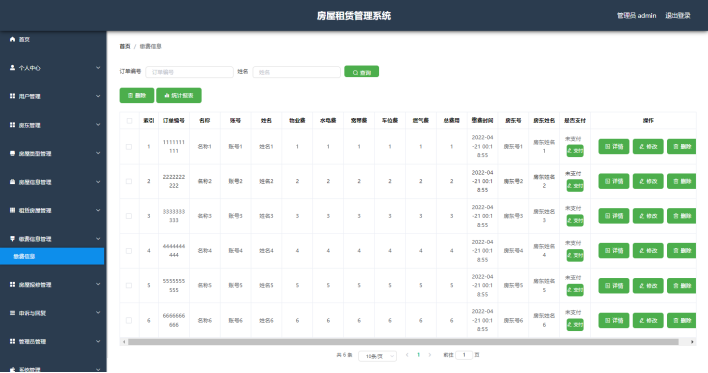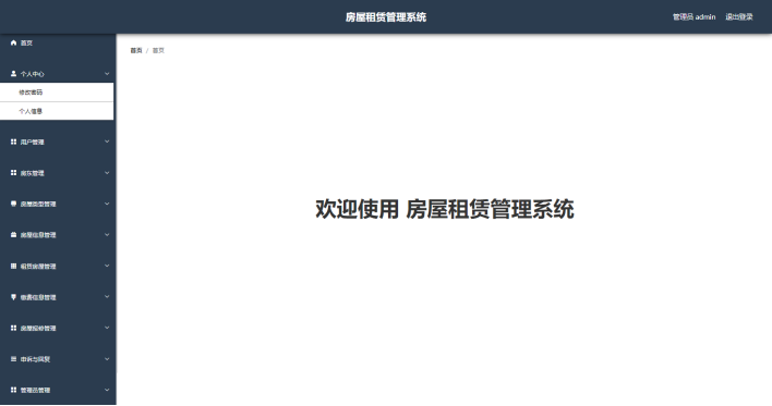 管理员:首页、个人中心、用户管理、房东管理、房屋类型管理、房屋信息管理、租赁房屋管理、 缴费信息管理、房屋报修管理、管理员管理、申诉与回复、系统管理等