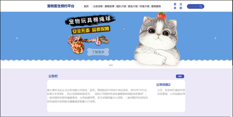 用户管理模块:注册登录、首页、公告消息、康复故事、团队介绍、医生介绍、科室介绍、爱宠服务、我的(我的账户、个人中心)等。