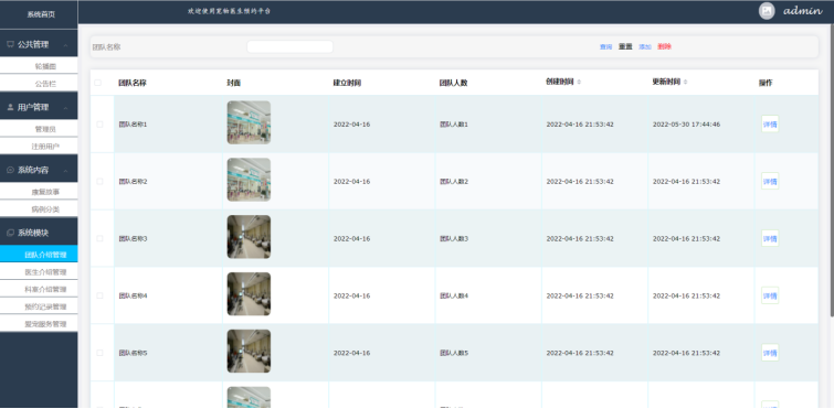 管理员:登录、公共管理、用户管理、系统系统内容管理界面(康复故事、案例分类)、 系统模块管理(团队介绍管理+医生介绍管理+科室介绍管理+预约记录管理+爱宠服务管理)
