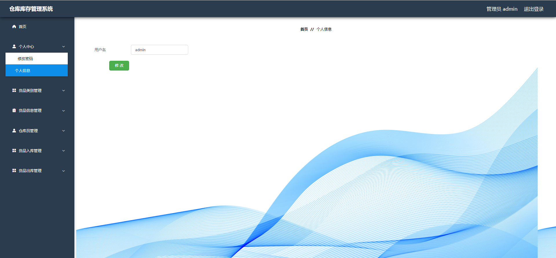 管理员:首页、个人中心、货品类别管理、货品信息管理、仓库员管理、货品入库管理、货品出库管理等