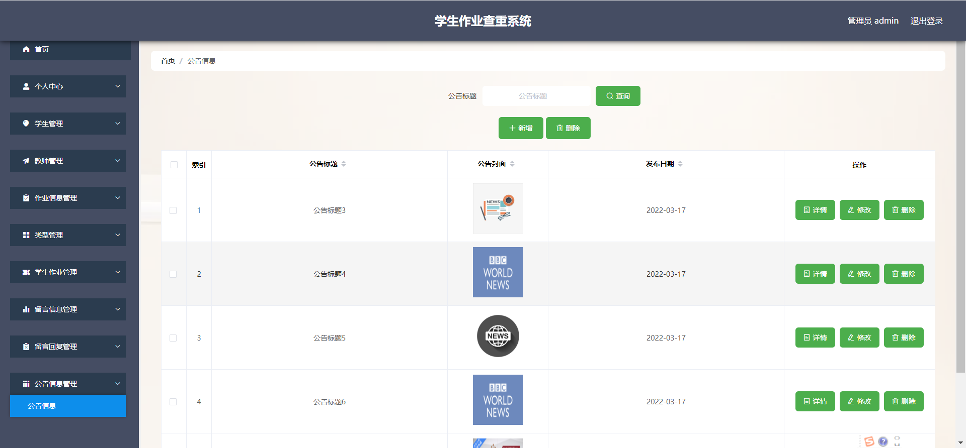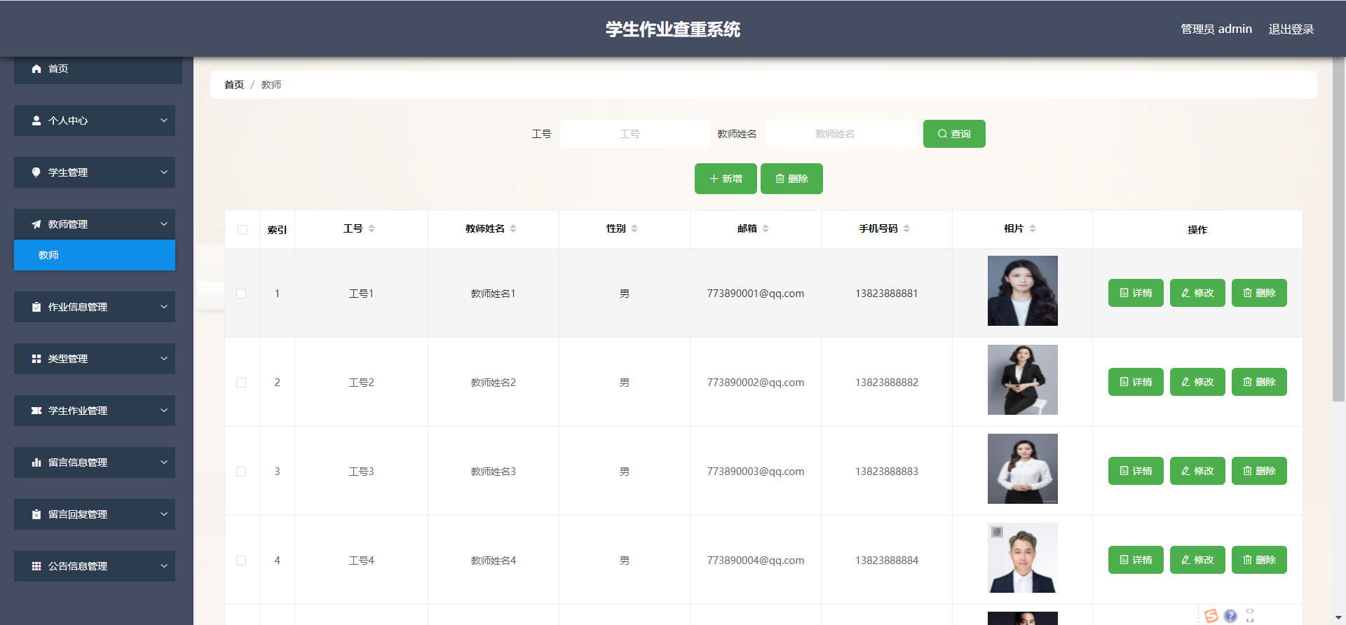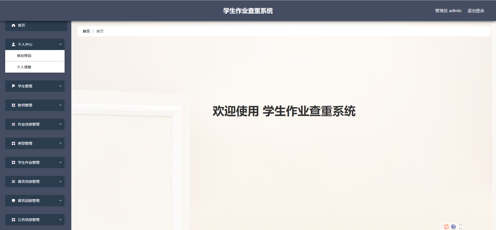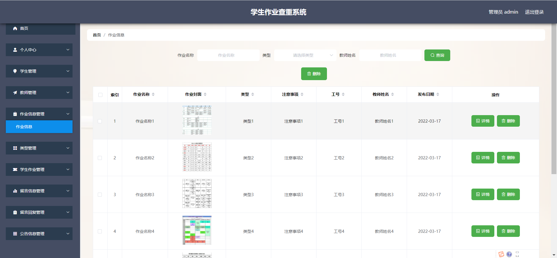 管理员:首页,个人中心,学生管理,教师管理,作业信息管理,类型管理, 学生作业管理,留言信息管理,留言回复管理,公告信息管理等功能,并进行详细操作
