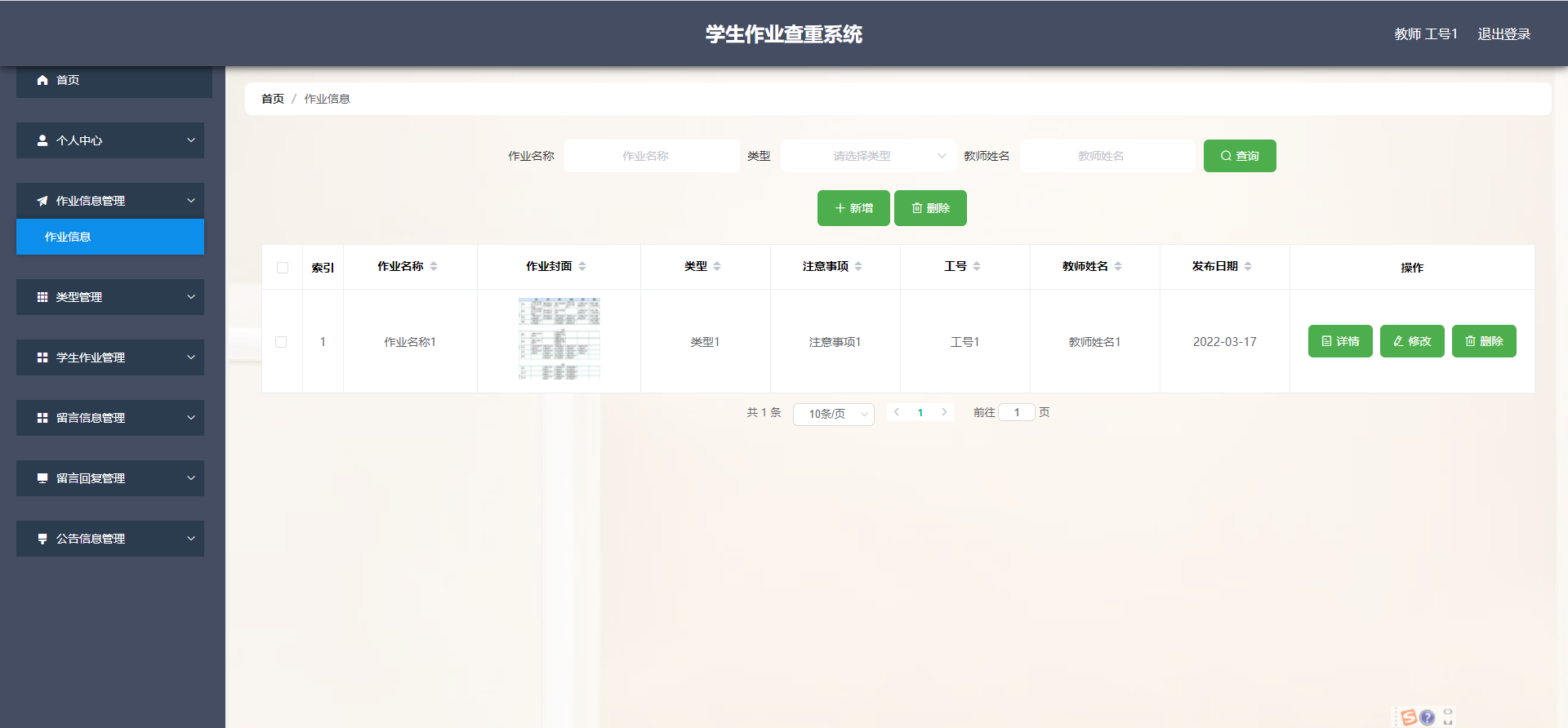 教师:首页,个人中心,作业信息管理,类型管理,学生作业管理,留言信息管理,留言回复管理,公告信息管理等