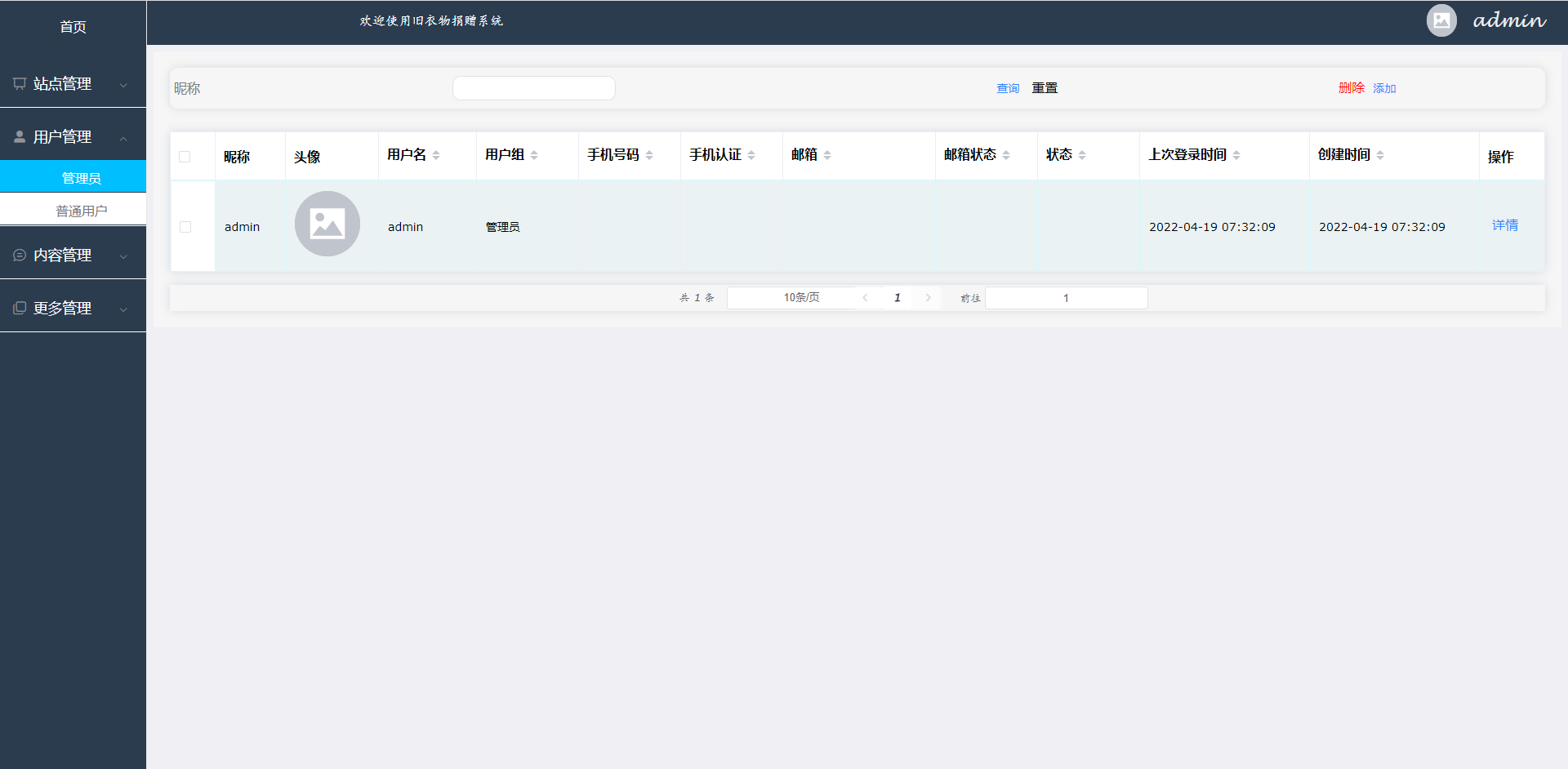 首页、站点管理(轮播图、公告栏)、用户管理(管理员、普通用户)、 内容模块(公益活动、公益活动分类)模块管理(捐赠信息、地区分类、物品分类、捐赠接收)