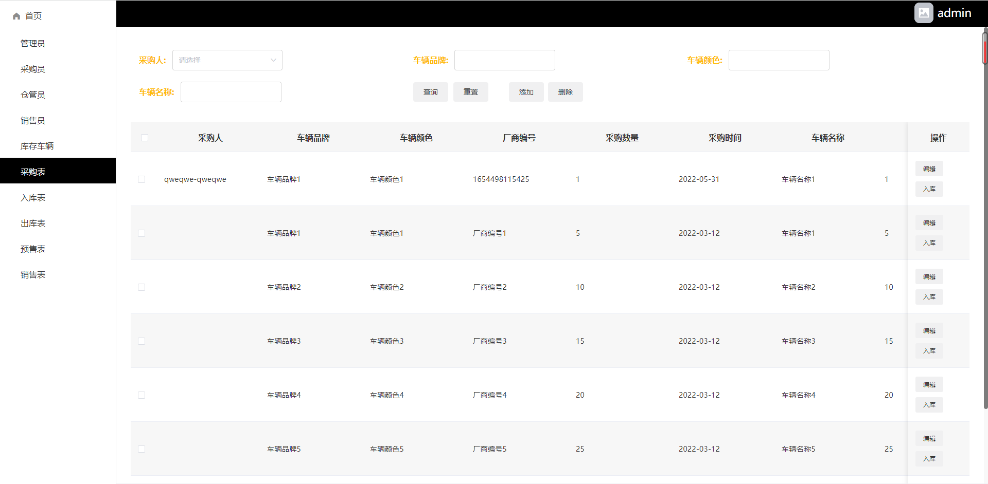 入库管理:对各种车辆的入库时间,数量,颜色的管理。