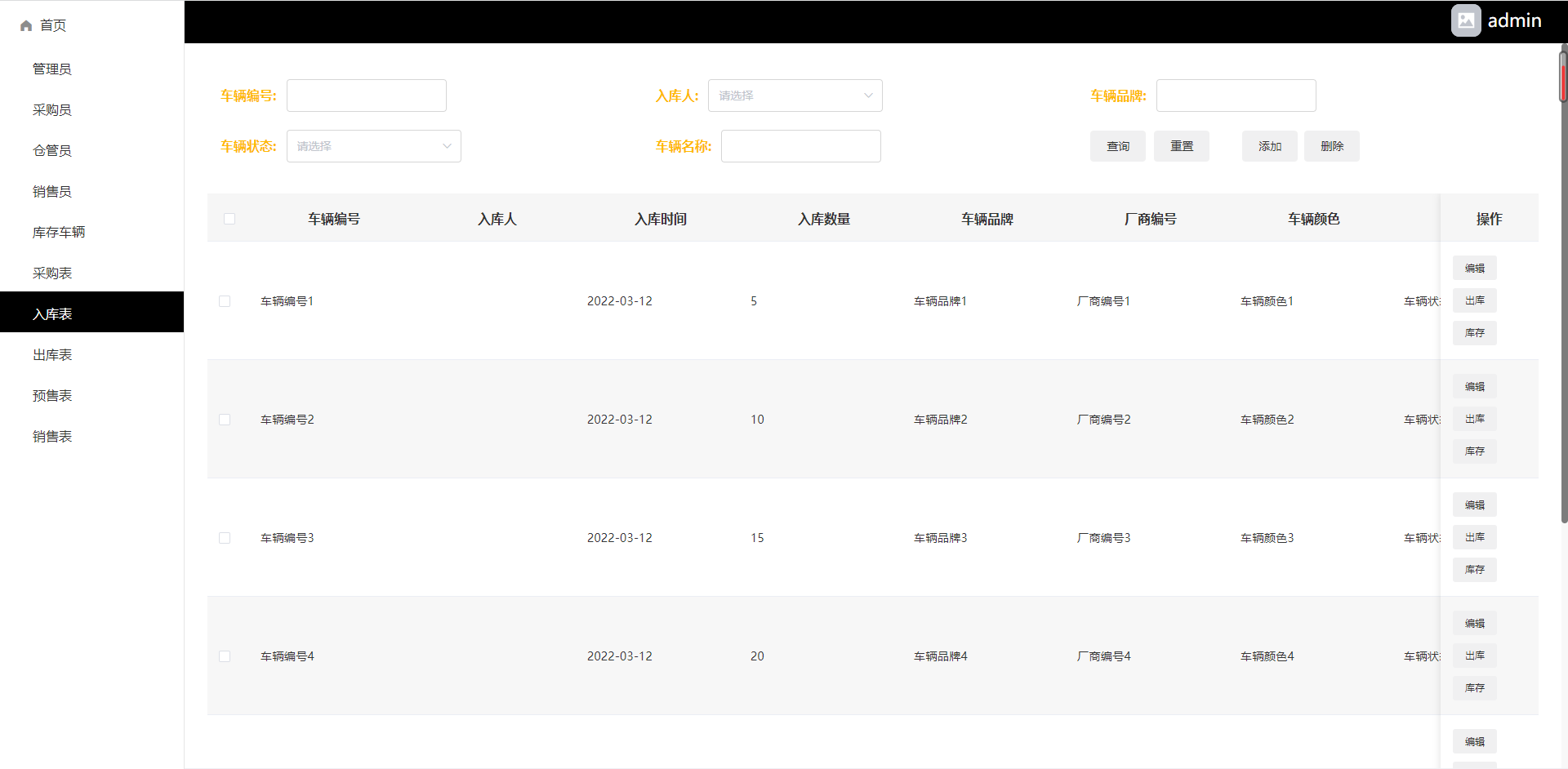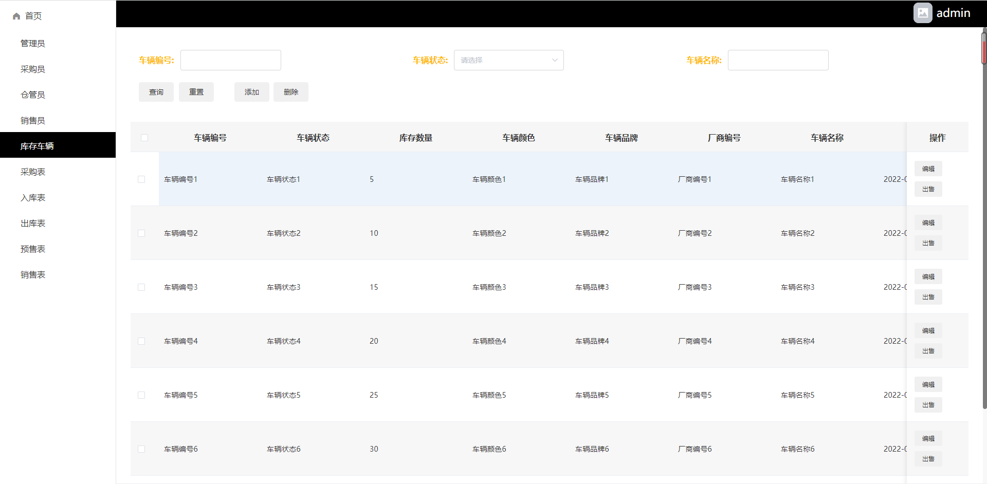 库存车辆管理:查看车辆编号,状态,库存数量等。