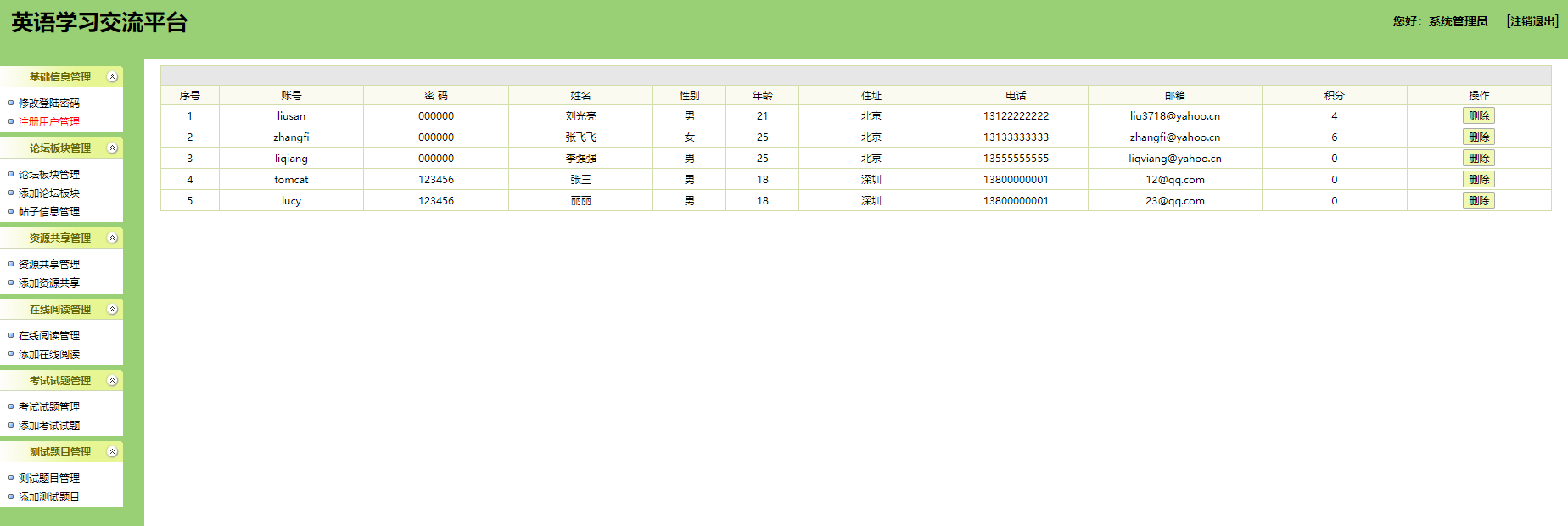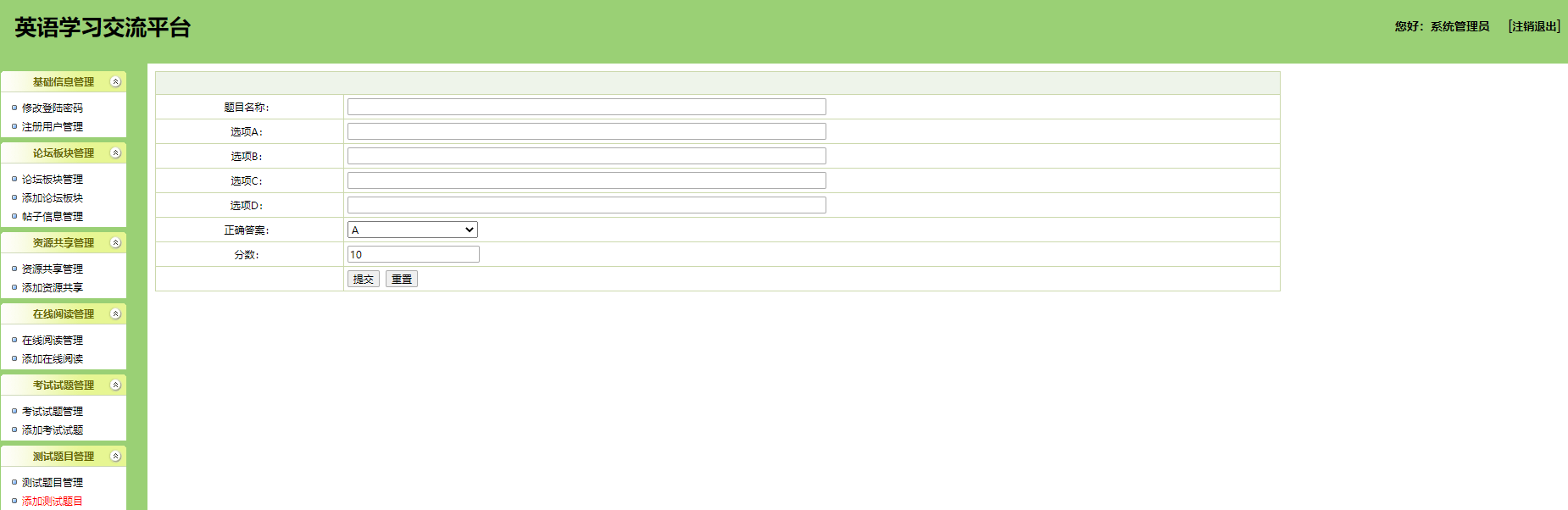 用户:可以注册、登录学习网站,可以在论坛专区发布、回复帖子;可以在资源共享专区下查看并下载各种资源;在线阅读区可以阅读英文文章;试题下载模块可以供用户下载各种经典试题;测试题目可以提供给用户测试,检验学习效果。