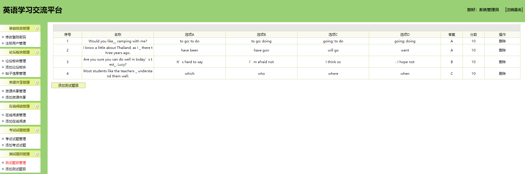 本系统为基于jsp+mysql的在线英语学习网站,包含用户、管理员登录权限,功能如下: