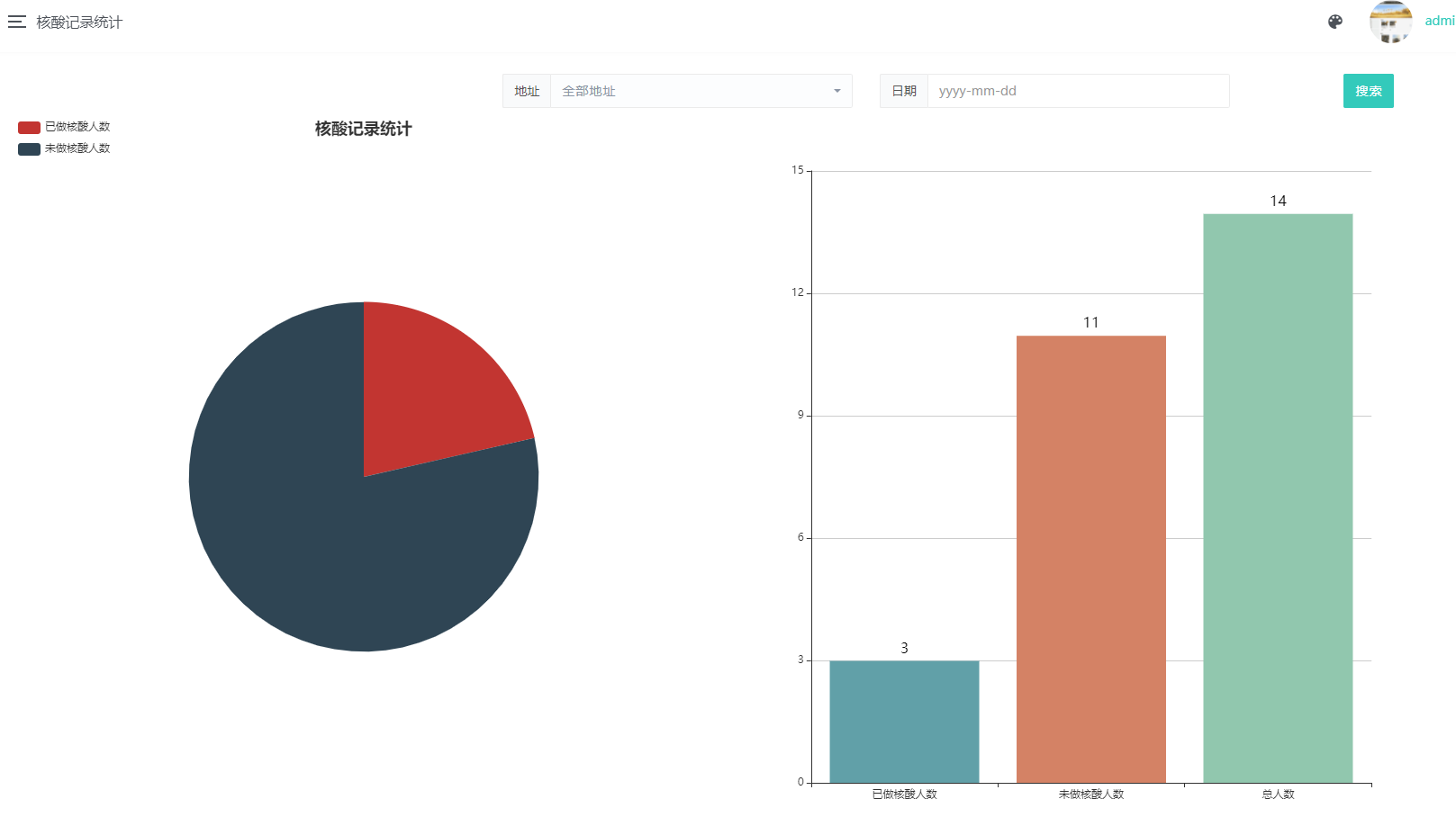项目分为超级管理员和普通管理员两个不同角色,管理员拥有系统管理、地址管理、核酸信息检测管理、个人信息管理等功能
