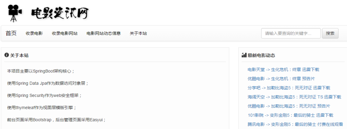 《电影资讯网》该项目采用技术:html +sprintboot+css+js等相关技术,项目含有源码、文档、配套开发软件、软件安装教程、项目发布教程等