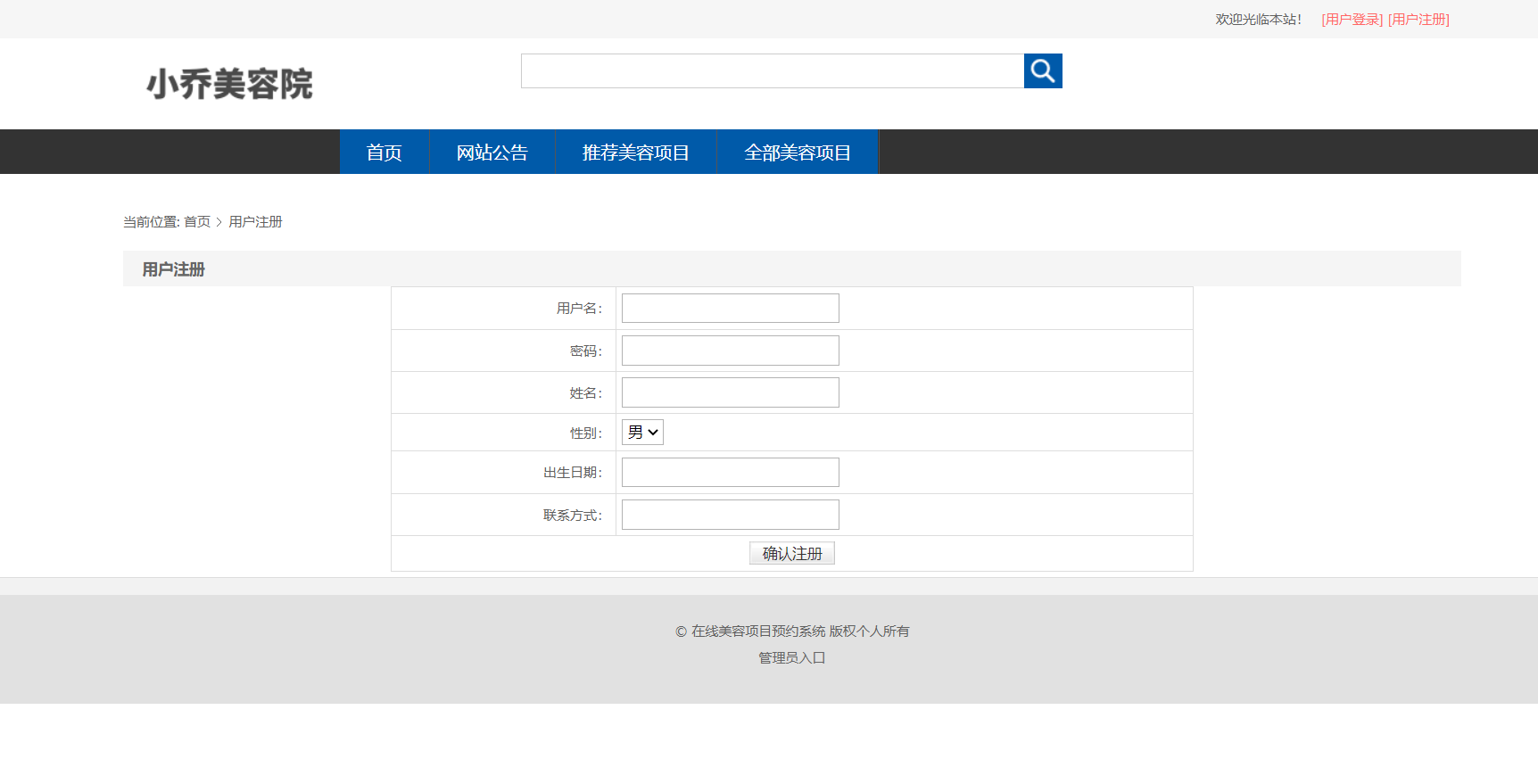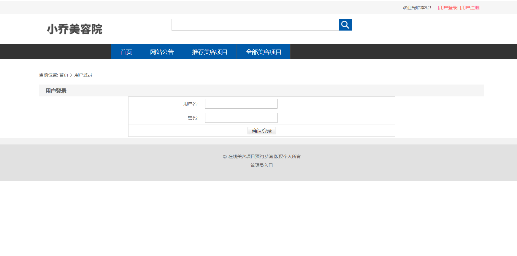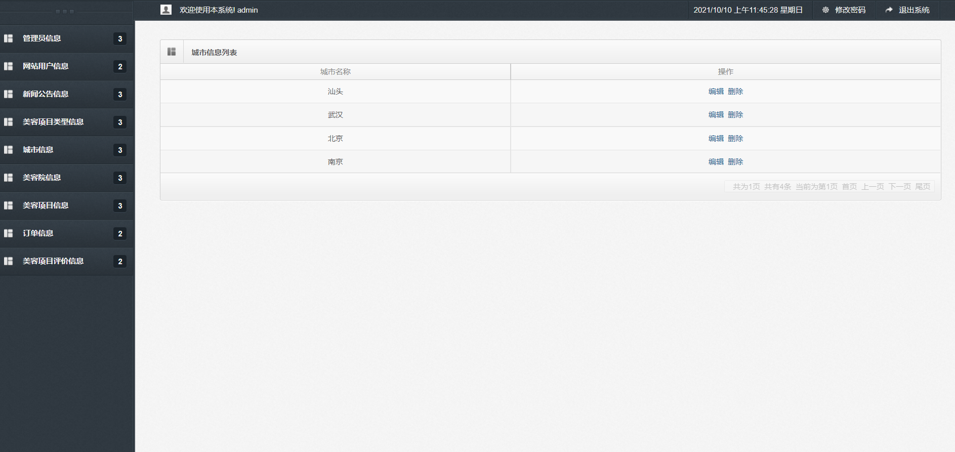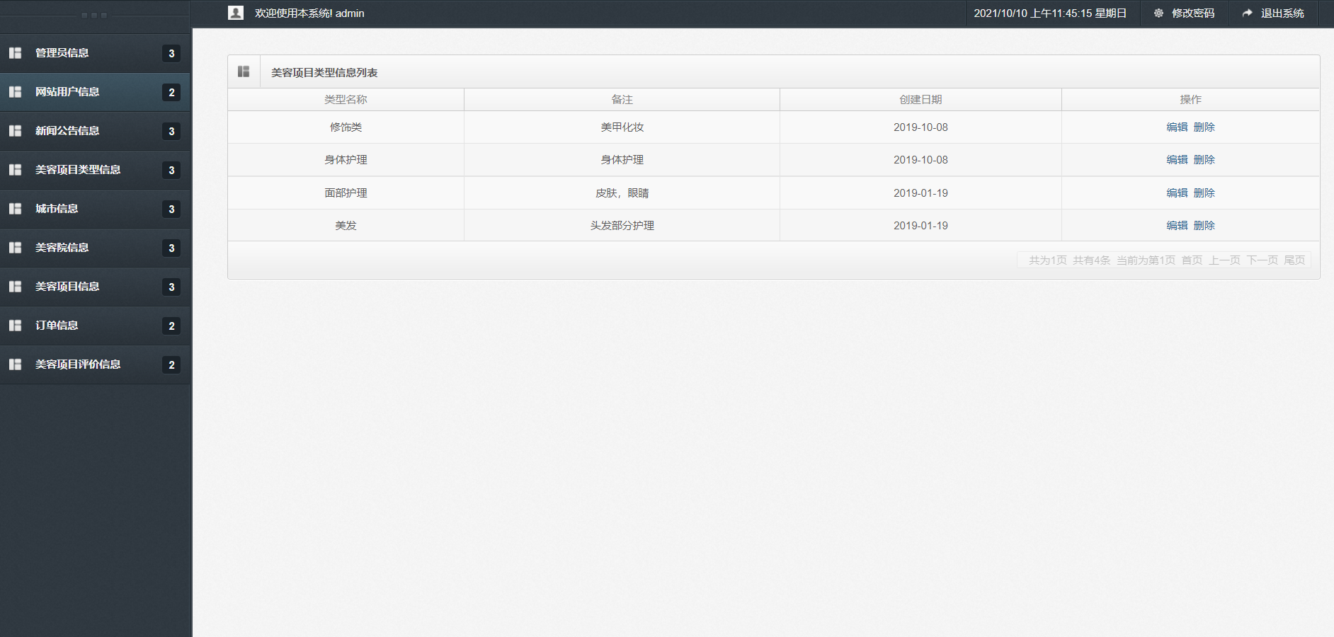 主要功能说明: 管理员角色包含以下功能:登录,首页,新增管理员,管理员信息列表,网站用户信息列表,新增新闻公告信息,新闻公告信息查询,美容项目类型信息查询,城市列表,