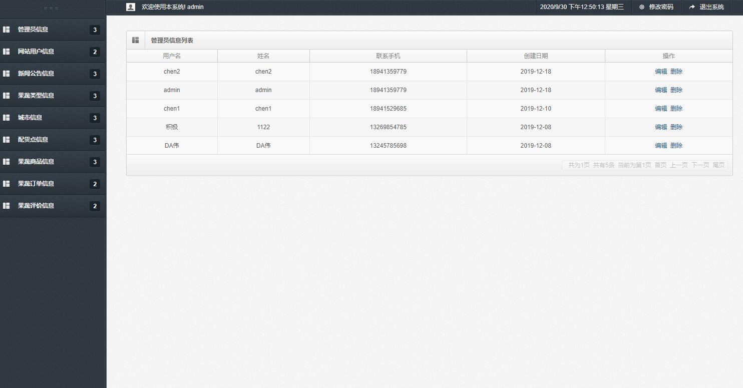 主要功能说明: 管理员角色包含以下功能:管理员登录,管理员管理,网站用户管理,新闻公告管理,果蔬类型管理,城市信息管理,配货点管理,果蔬商品管理,果蔬订单管理,果蔬评价管理等功能。
