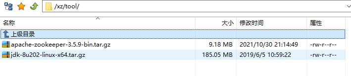 3、把下载好的apache-zookeeper-3.5.9-bin.tar.gz安装包上传到新建的/xz/tool/目录下,如下所示: