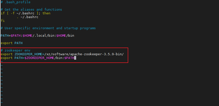 export ZOOKEEPER_HOME=/xz/software/apache-zookeeper-3.5.9-bin/