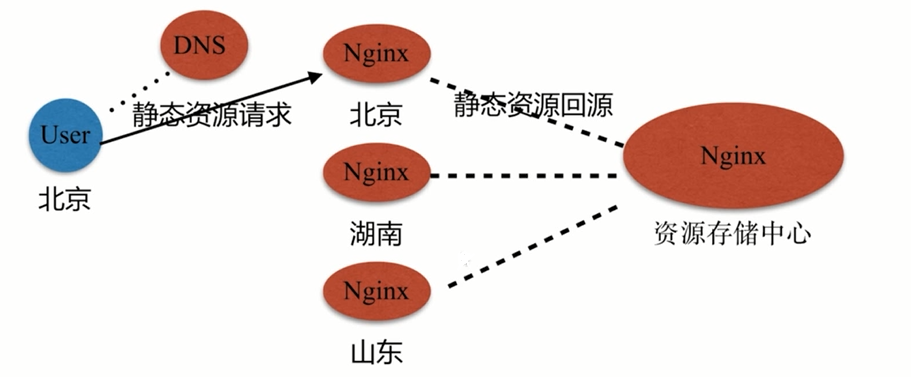 - 北京的用户通过dns技术把请求动态的定位到北京的代理服务器上,就不需要再去请求位于海南的资源存储中心服务器,节省了用户请求传输延迟;