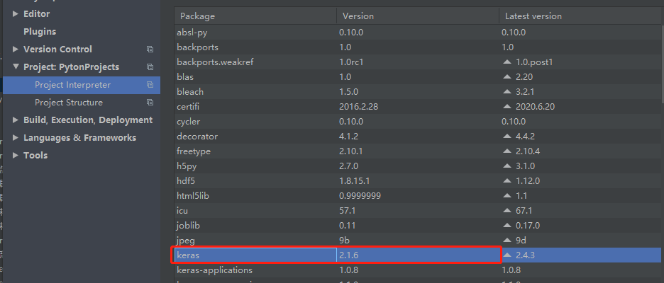 4、lz的pycharm中把tf和keras版本更改成了tensorflow1.5.0和keras2.1.6版本,报错消失,如下图: