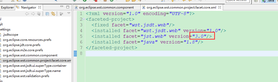 4、打开org.eclipse.wst.common.project.facet.core.xml,把 faced=“jst.web” version=“3.0” 改成 faced=“jst.web” version=“2.5”