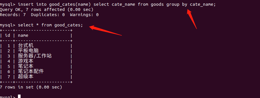 insert into good_cates(name) select cate_name from goods group by cate_name;