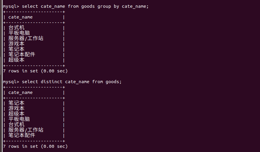 select cate_name from goods group by cate_name; 【等价select distinct cate_name from goods;】