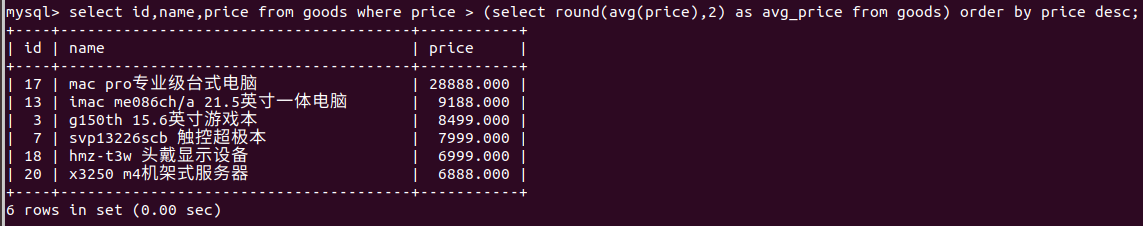 select id,name,price from goods where price > (select round(avg(price),2) as avg_price from goods) order by price desc;