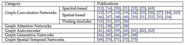除了图卷积网络,近几年还开发出了很多替代的图神经网络。这些方法包括图注意力网络(GAT)、图自编码器、图生成网络以及图时空网络。关于这些方法的分类细节详见第三章。