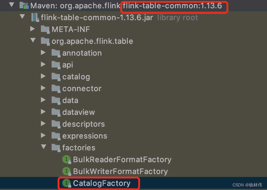 可以看到是没有依赖到CatalogFactory,全局搜索,可以看到该类在flink-table-common-1.13.6.jar这个包。