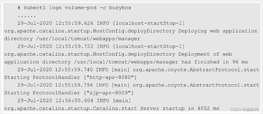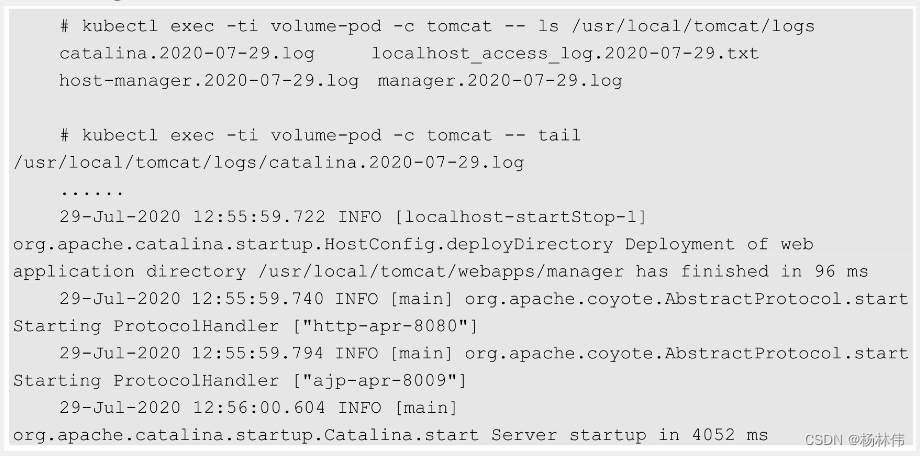 logreader容器的启动命令为tail-f/logs/catalina*.log,我们可以通过kubectl logs 命令查看logreader容器的输出内容: 这个文件为