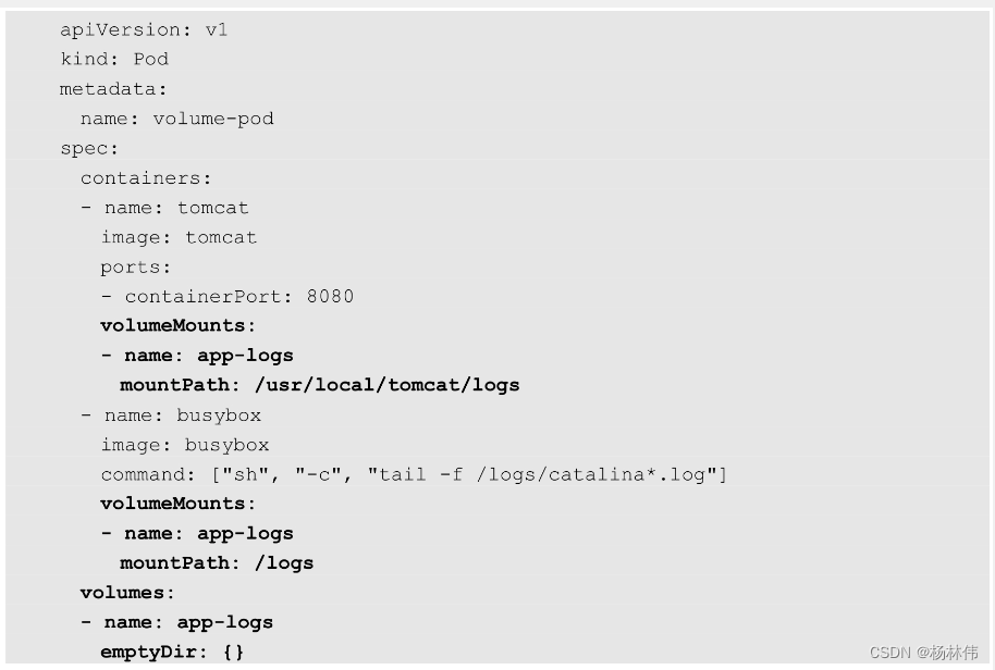 Volume 名称为 app-logs,类型为 emptyDir(也可以设置为其他类型),挂载到 tomcat容器内 的/usr/local/tomcat/logs目录下,同时挂载到logreader容器内的/logs目录下。 tomcat容器在启动后会向/usr/local/tomcat/logs目录写文件,logreader 容器就可以读取其中的文件了。