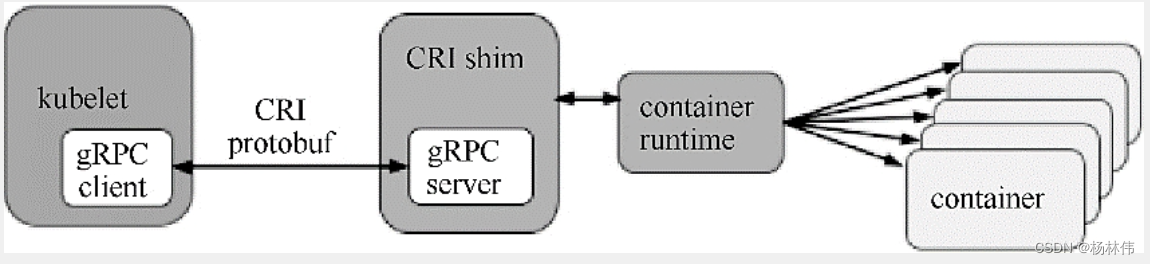 kubelet 使用 gRPC 框架通过 UNIX Socket 与容器运行时(或 CRI 代理)进行通信。在这个过程中kubelet是客户端,CRI 代理(shim)是服务端,如图所示: