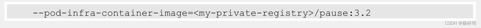 此外,Kubernetes 对于创建 Pod 需要使用一个名为“pause”的镜像,tag名为 k8s.gcr.io/pause:3.2”,默认从镜像库k8s.gcr.io下载,在私有云环境中可以将其上传到私有镜像库,并修改 kubelet 的启动参数-pod-infra-container--image,将其设置为使用镜像库的镜像名称,例如: